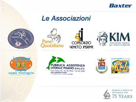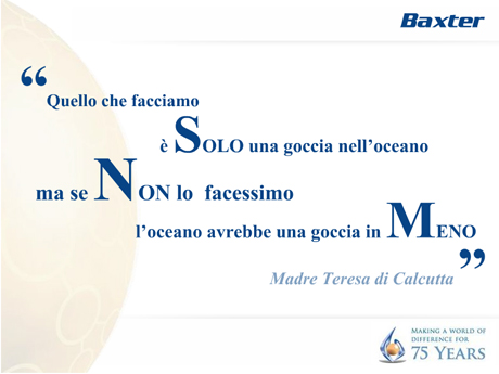 Società a carattere multinazionale che opera in diversi settori in ambito sanitario. Fondata negli Stati Uniti, nel 1931, dal Dott. Don Baxter, è presente in oltre 100 Paesi del mondo. Oltre all’indiscussa qualità dei prodotti e alle avanzate tecnologie impiegate nei dispositivi medici, nell’industria farmaceutica e nelle biotecnologie, la forza speciale di Baxter è rappresentata dal suo team.