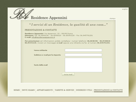 www.residenceappennini.itIl Residence Appennini è una confortevole casa – albergo situata al centro della città tra la Via Nomentana e Corso Trieste in una delle zone più esclusive di Roma. Una struttura bella ed elegante esternamente ed internamente che assicura stile e comodità ai suoi ospiti. Non un albergo ma veri appartamenti da 35 a 45 mq. Arredati con gusto e dotati di tutto il necessario per un soggiorno di qualità in un residence al centro di Roma.