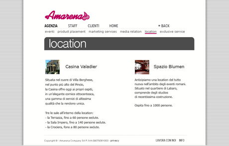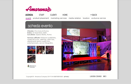 www.amarena.bizSviluppare relazioni tra aziende e consumatori, creare specifiche identità di prodotti, marchi e società, mettere in comunicazione organizzazioni e loro utenti, costruire consenso intorno a particolari iniziative e eventi, divulgare messaggi e concetti: questi sono i risultati del lavoro che Amarena realizza utilizzando tutti gli strumenti e tutti i mezzi di comunicazione possibili.