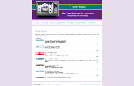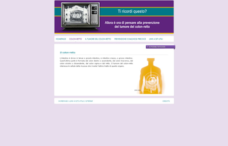 www.tumorecolonretto.itSito relativo alla Campagna di informazione e sensibilizzazione sulla prevenzione e la diagnosi precoce del tumore del colon-retto in tutta Italia sostenuto da Roche S.p.A. e promosso da A.I.STOM. - Associazione Italiana Stomizzati ONLUS - e AIOM - Associazione Italiana Oncologia Medica - con il patrocinio del Ministero della Salute e della F.A.V.O. - Federazione Italiana delle Associazioni di Volontariato in Oncologia.