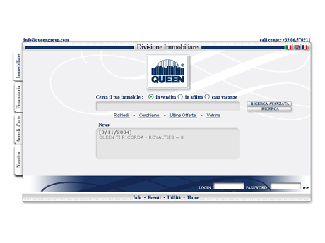 www.queengroup.comNuovo portale per Queen S.p.A. suddiviso in quattro divisioni: immobiliare, nautica, arredi d'arte e finanziaria. La piattaforma supporta 8 lingue. L'intranet su cui gira il portale è troppo vasta e complessa per essere spiegata in questa sede (vedi anche Intranet Queen).