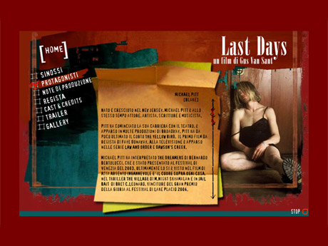 www.bimfilm.com/lastdaysLast Days racconta liberamente gli ultimi giorni di Kurt Cobain, leader dei Nirvana e grande mito della musica rock. Cast inedito e molto promettente: l'italiana Asia Argento recita al fianco di Michael Pitt (protagonista di The Dreamers di Bertolucci) nel nuovo film del migliore regista americano indipendente, Gus Van Sant, già candidato all'Oscar per Will Hunting - Genio Ribelle e vincitore della Palma d'Oro a Cannes 2003 per Elephant. Last Days potrebbe rivelarsi uno dei titoli di punta del prossimo Festival di Cannes.